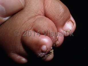Clinical image of Pseudoainhum - imageId=7139648. Click to open in gallery.  caption: 'Crusted constriction bands on the toes.'