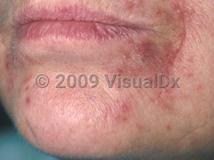 Periorificial dermatitis, also referred to as perioral dermatitis when the perioral area only is affected, is a localized inflammatory disorder of uncertain etiology. It manifests as an erythematous papular and pustular eruption involving the nasolabial folds, the upper and lower cutaneous lip, and the chin. The lip margin and the immediate circumoral area are typically spared. Periorbital involvement, predominantly of the lower and lateral eyelids, may occur.